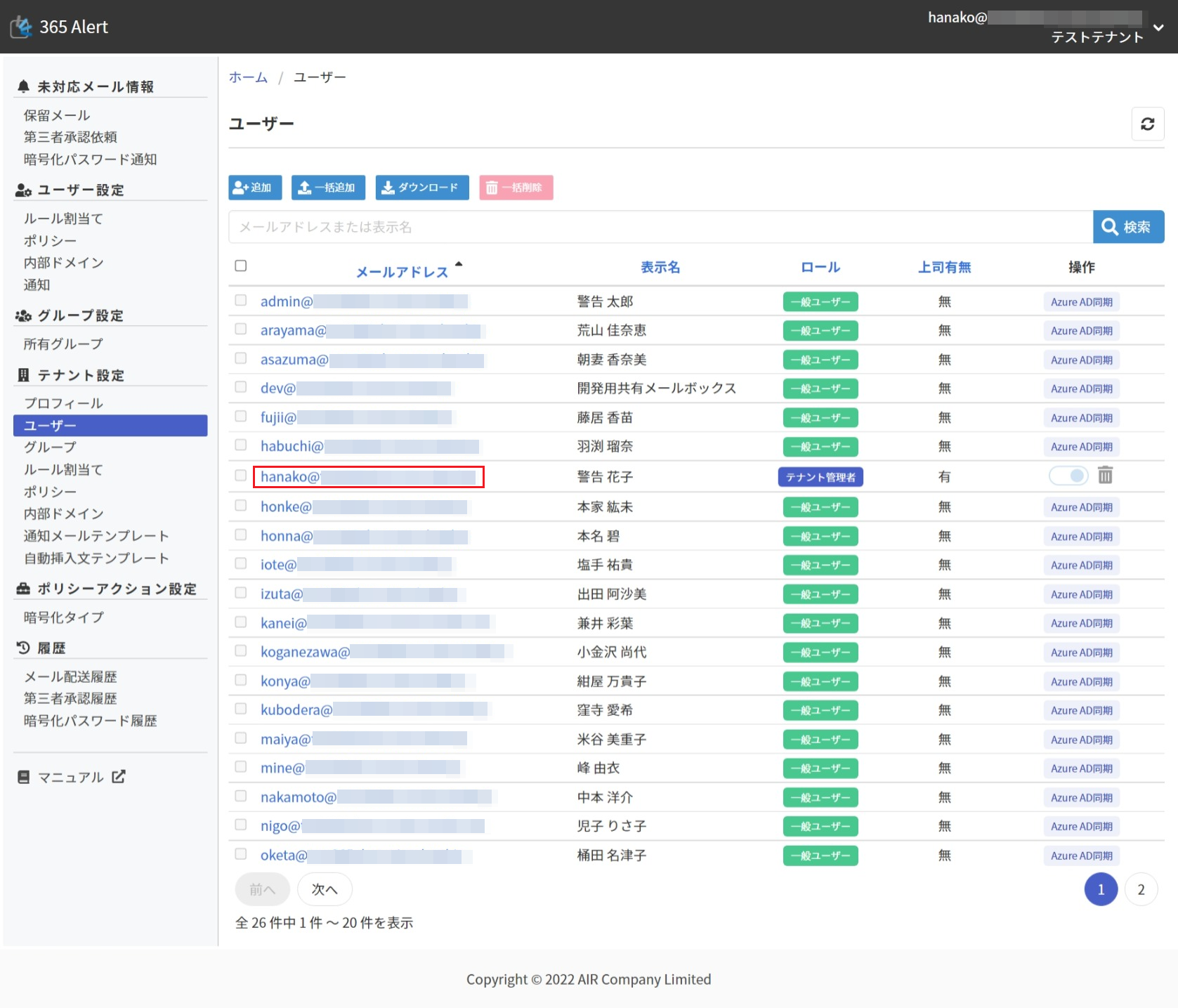 1. テナント管理者ユーザーで、365 Alert管理ポータルにサインインします。