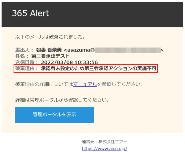 第三者承認アクションで承認されなかった場合には、以下の内容の破棄通知メールが届きます。