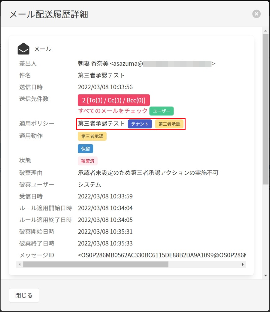 第三者承認アクションで否認承認者の1人が否認したためメールが破棄されました。