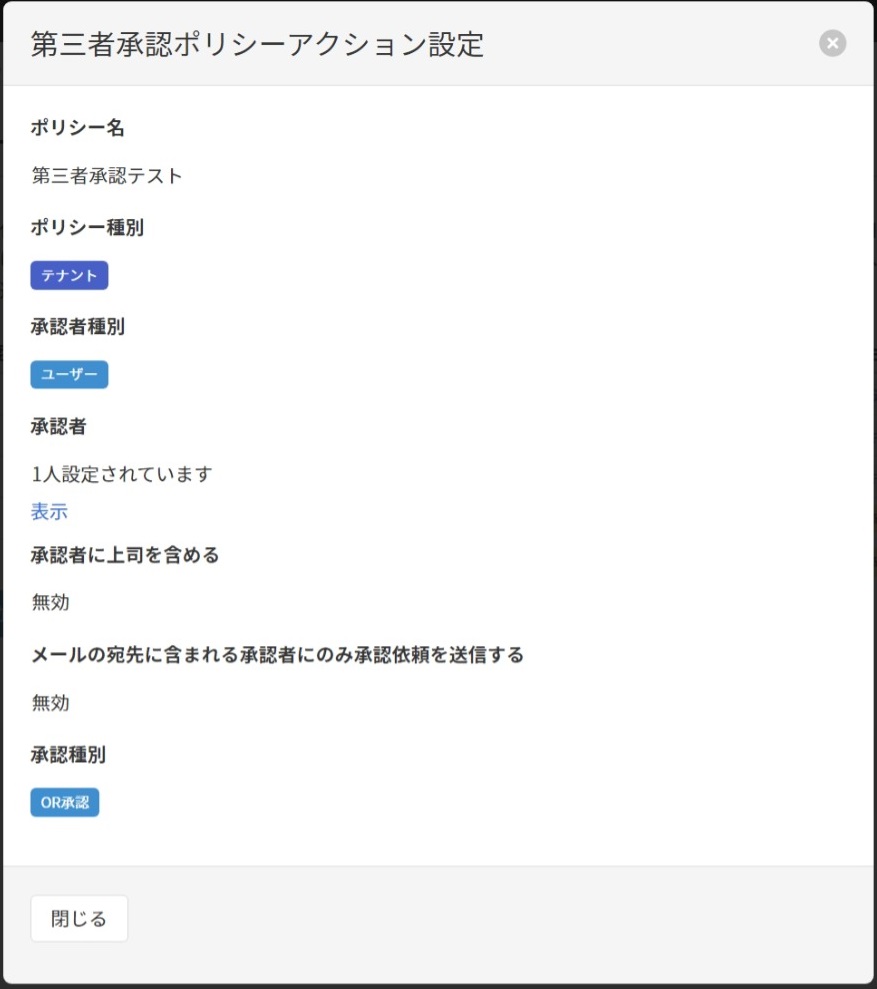 2. 以下の画面が表示されますので、[適用ポリシー]項目に、「名前 種別 アクション」の形式で表示されている適用されたポリシーの中から アクション第三者承認 の行を探し、名前種別 を取得します。
