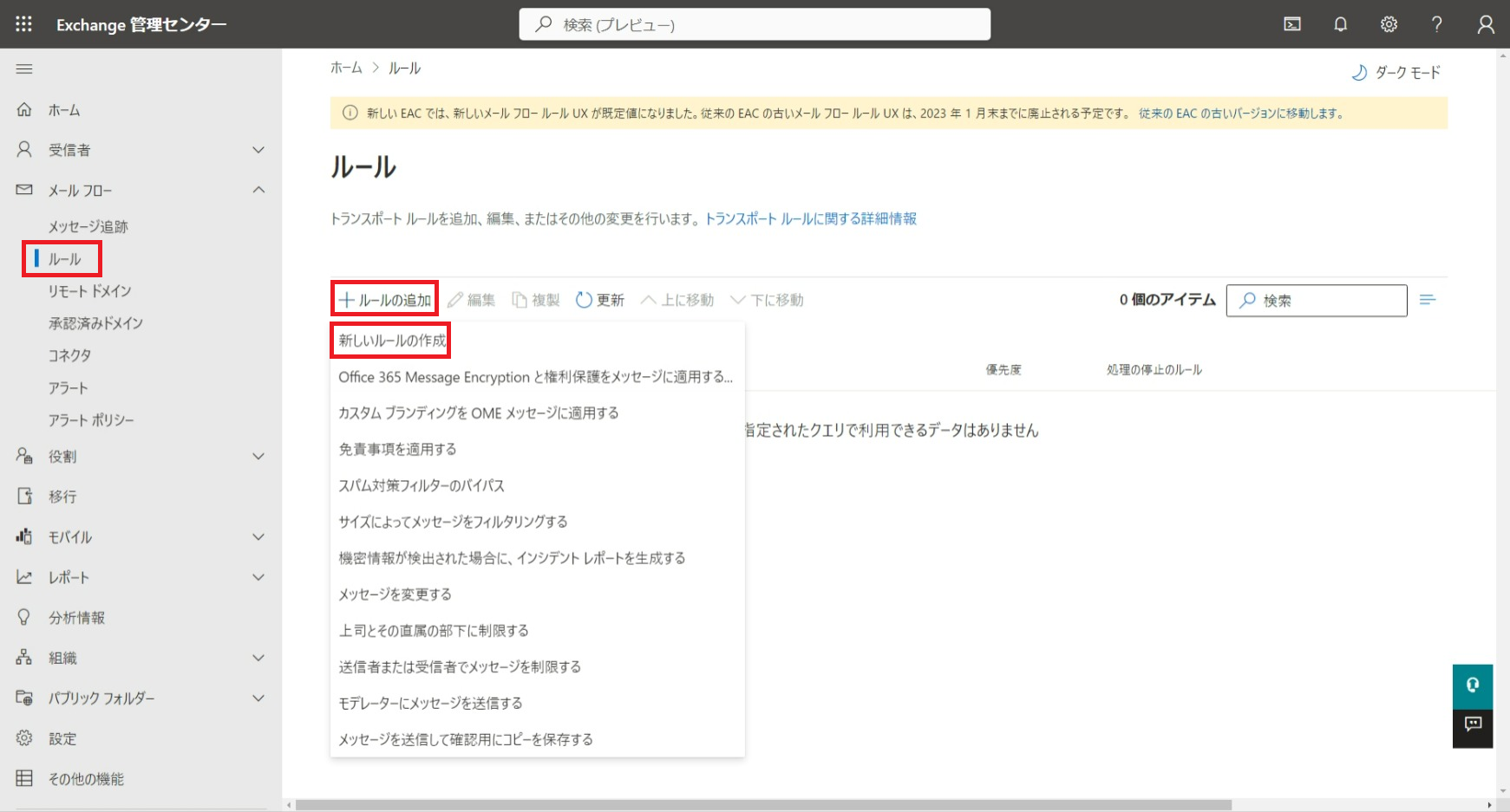 2. 画面左のメニューから[メールフロー]>[ルール]をクリックします。表示された画面で[+ルールの追加]をクリックし、[新しいルールの作成]を選択します。