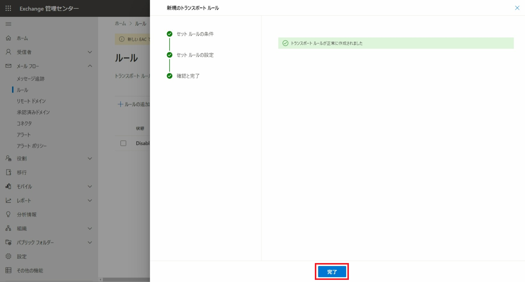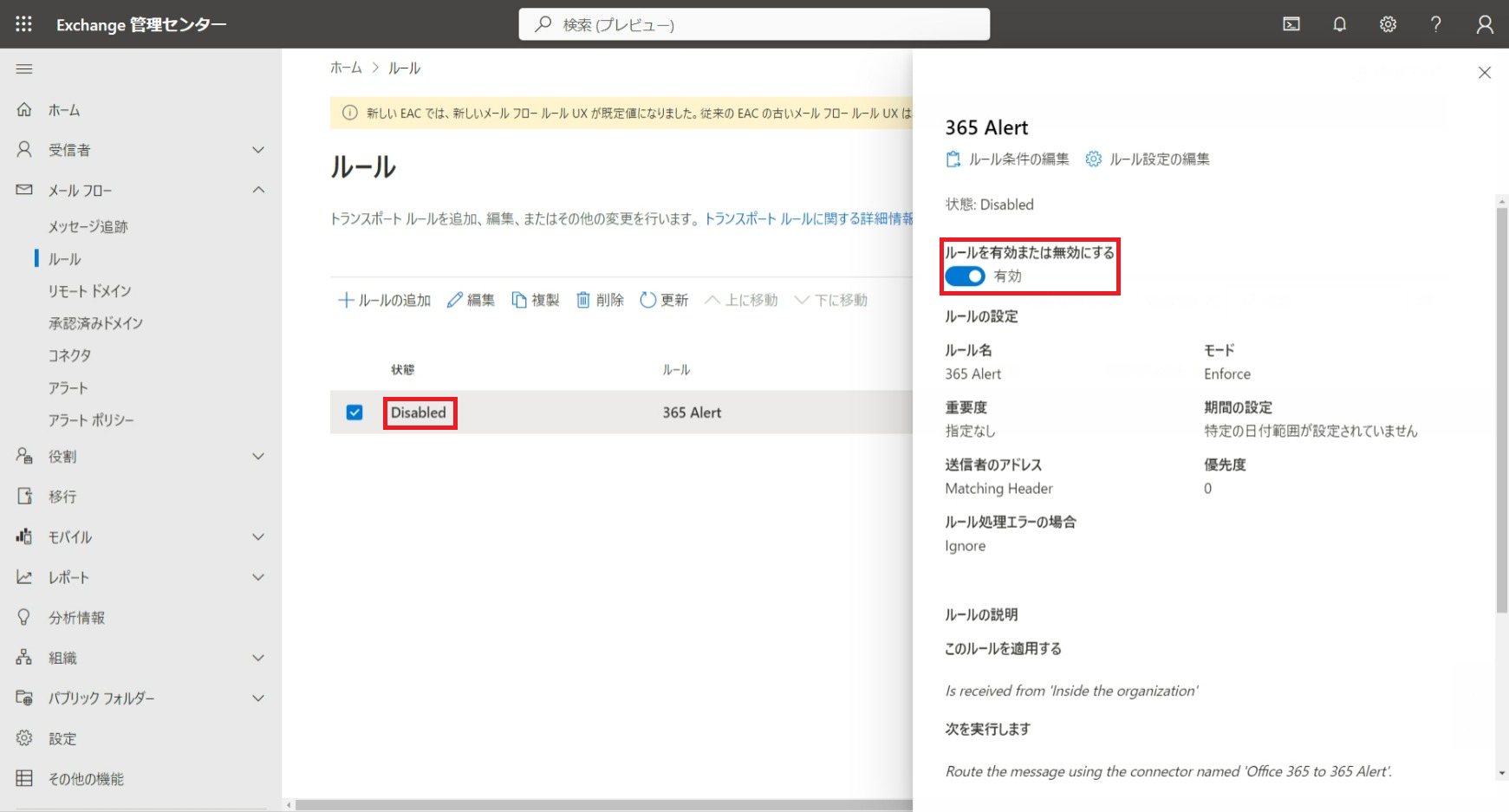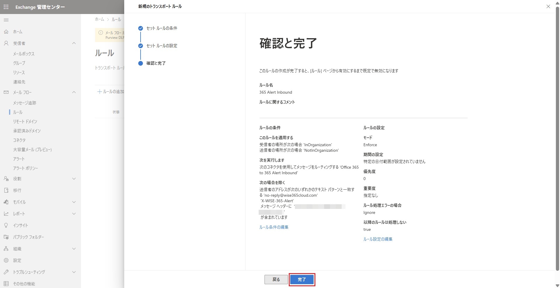 以上で、365 Alert Inboundメールフロールールの作成は完了です。
