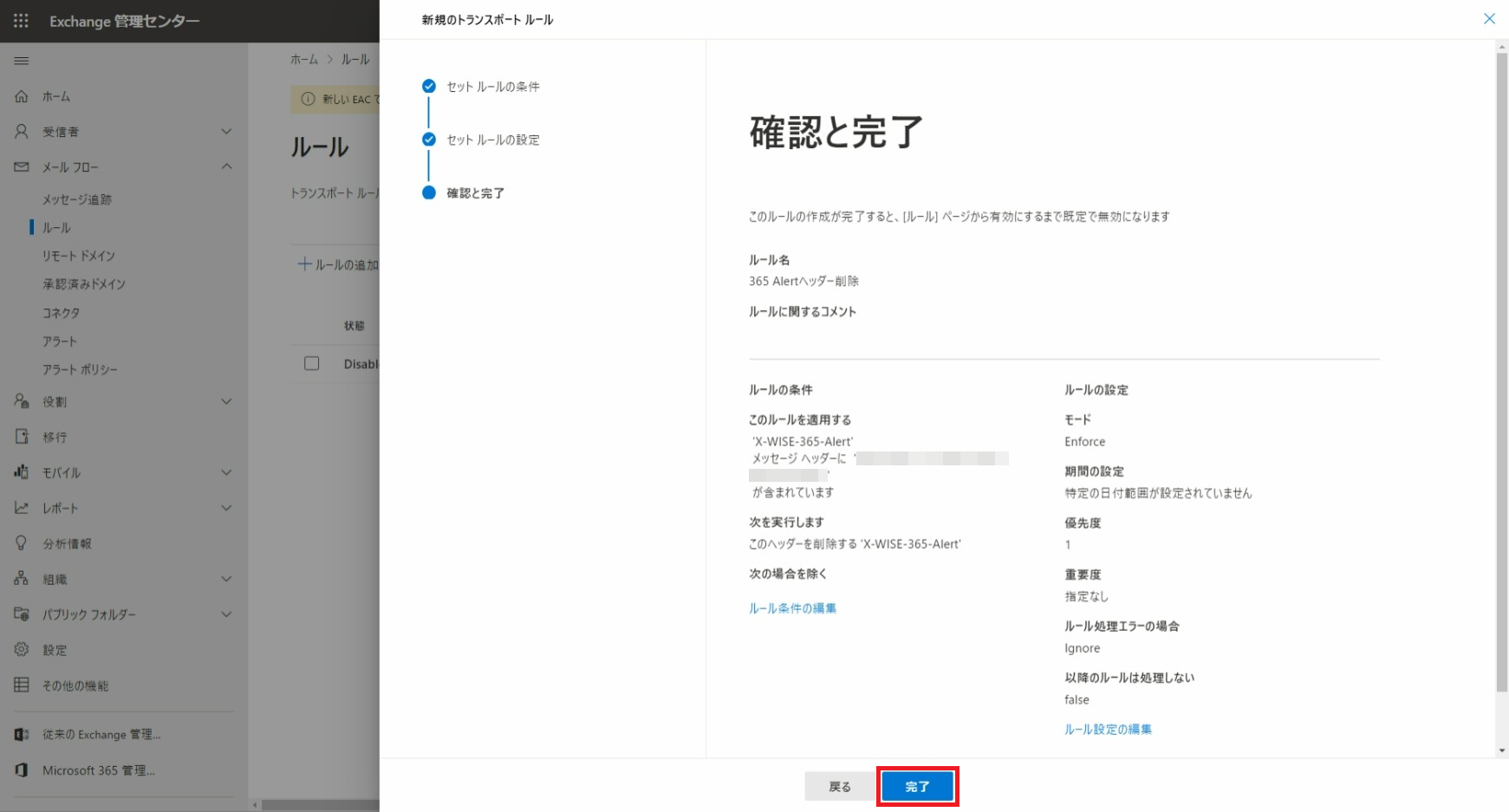 以上で、365 Alertヘッダー削除メールフロールールの作成は完了です。