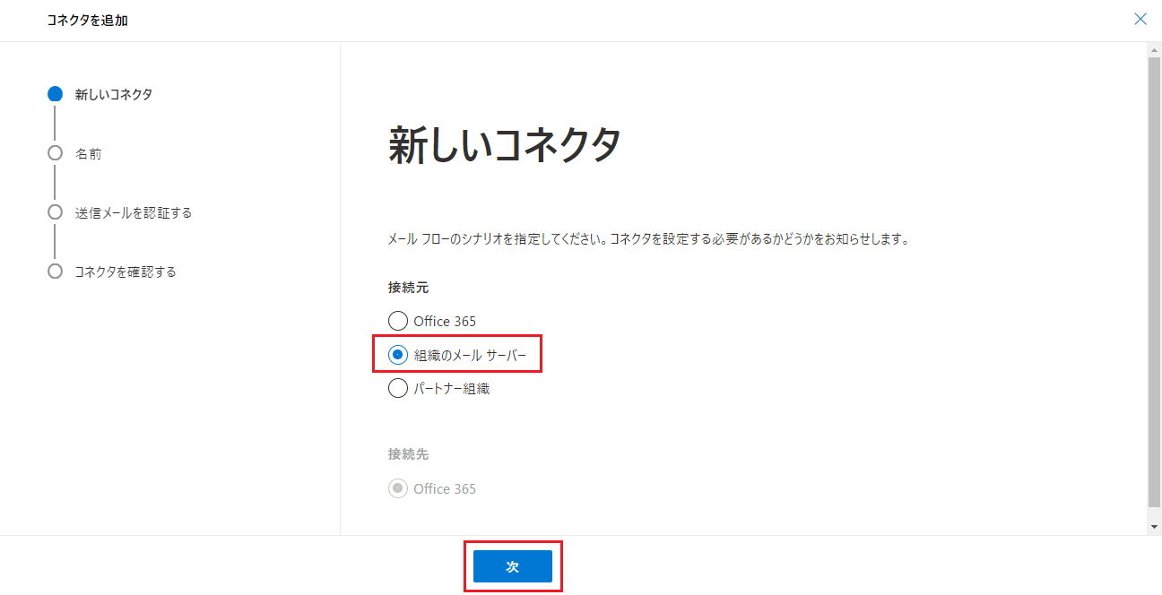 3. コネクタの新規作成ウィザードが表示されます。次に示すメールフローのシナリオを設定し、[次]をクリックします。