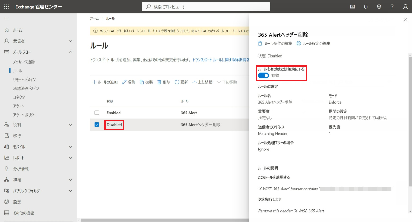365 Alertヘッダー削除メールループを防ぐためのヘッダーであるX-WISE-365-Alertヘッダーを削除するためのメールフロールール。