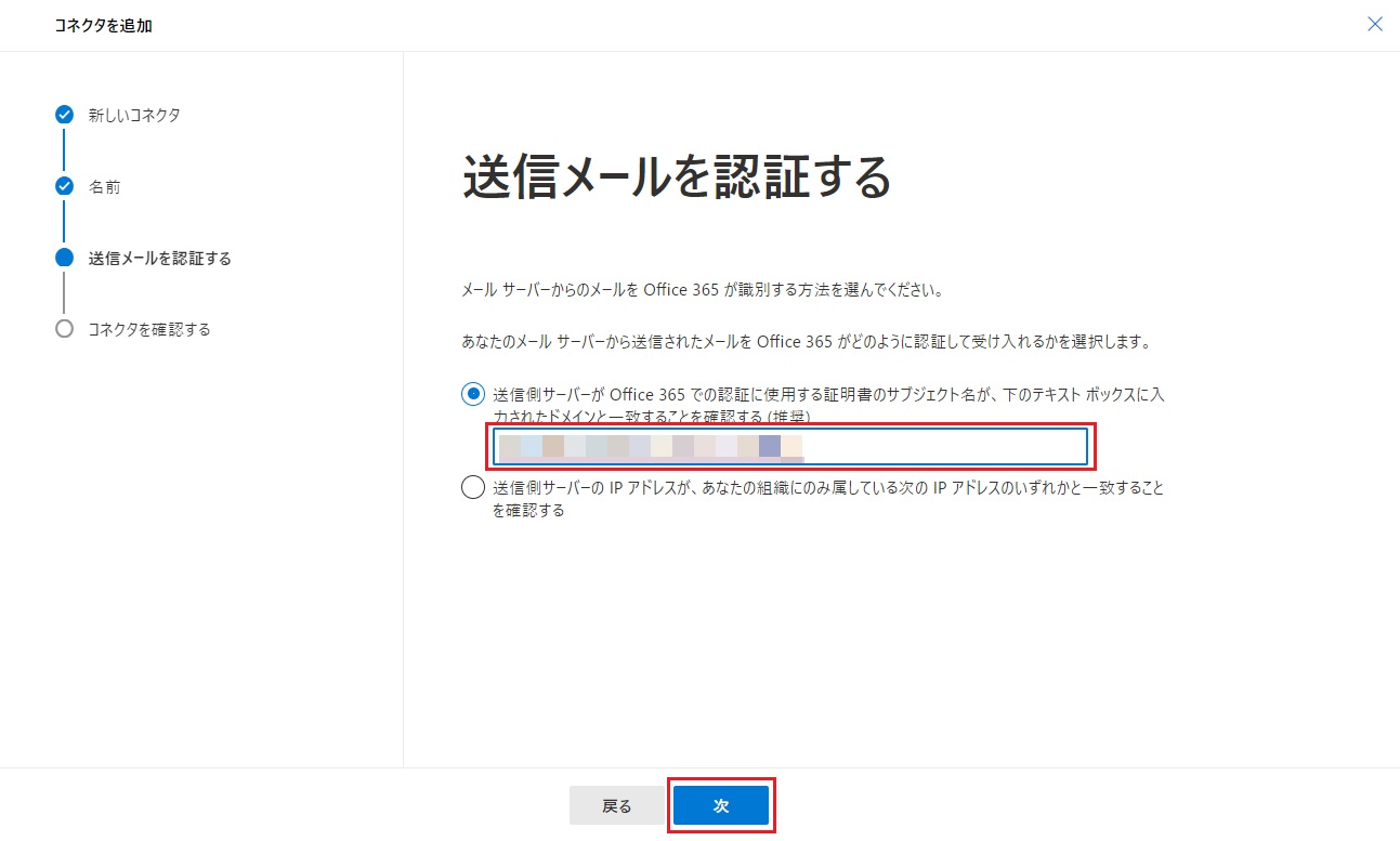 6. 表示された画面で、入力欄に「365 Alert受信用SMTPサーバー」(取得方法は下記NOTE参照)を入力し、[+]をクリックします。以下の画面が表示されたら、[次]をクリックします。