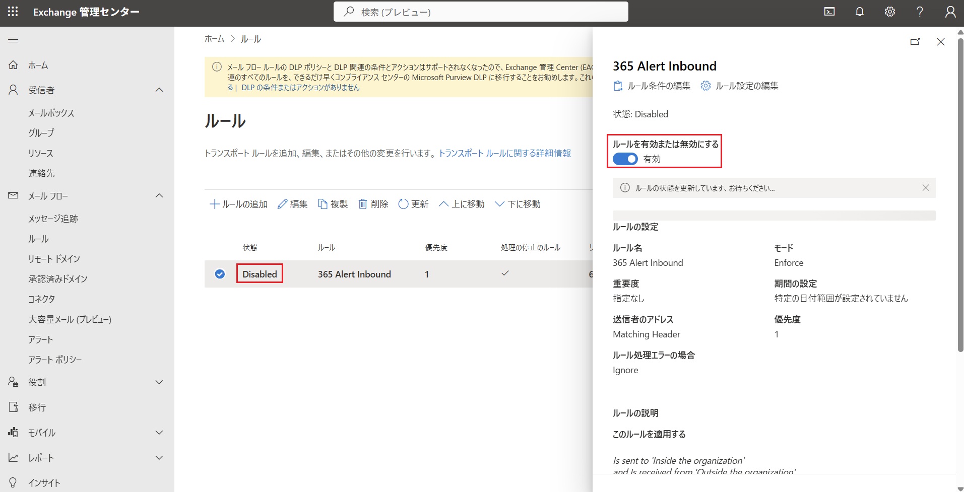 7. メールフロールールの優先度を参照して365 Alert Inboundメールフロールールの優先度を調整してください。
