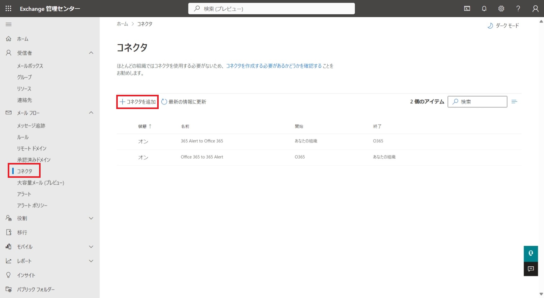 2. 画面左のメニューから[メールフロー]>[コネクタ]をクリックします。表示された画面で[+コネクタを追加]をクリックします。