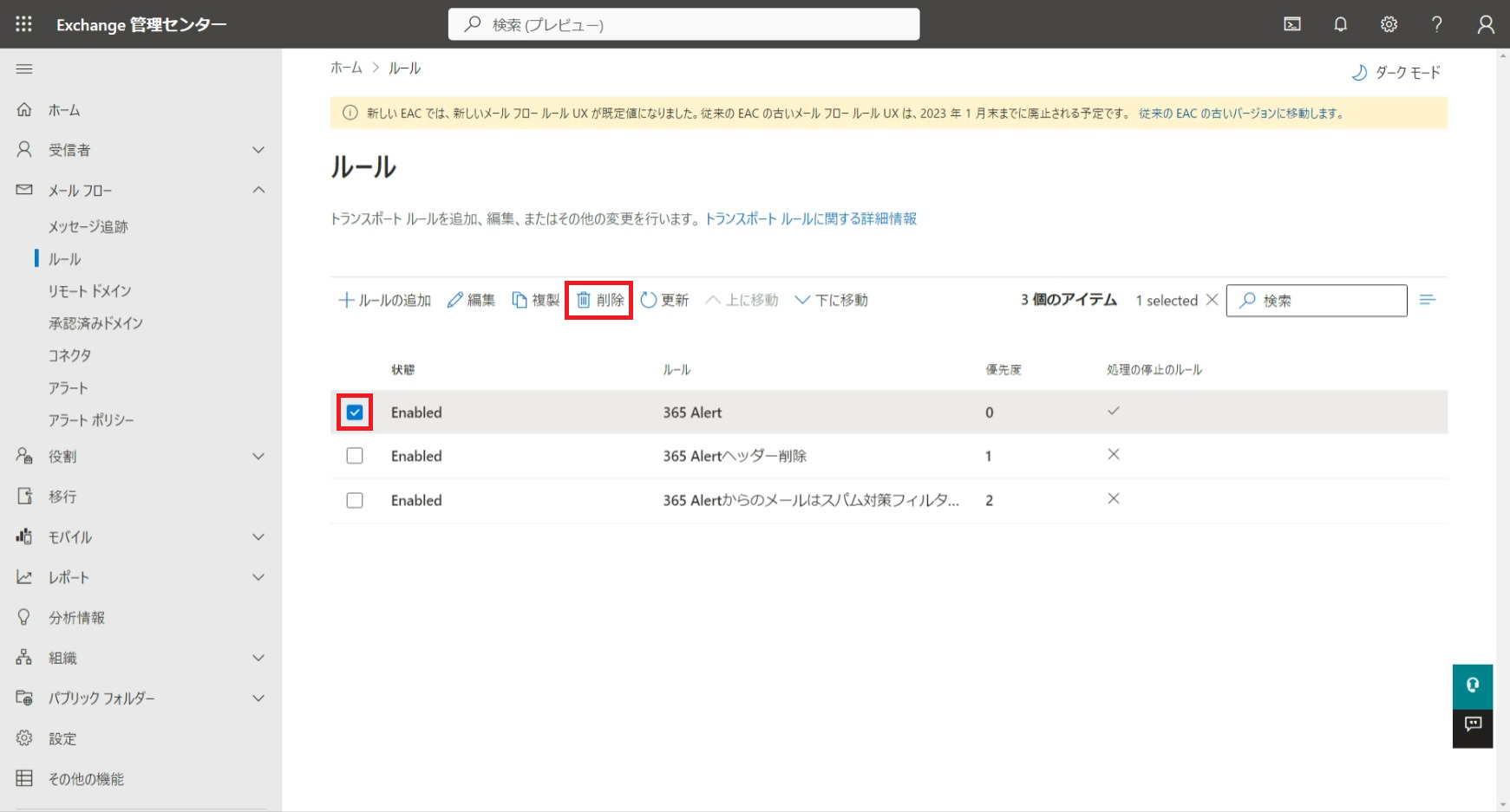以下では、365 Alertで使用するExchange Onlineのメールフロールールとコネクタの設定を削除する手順を記載します。