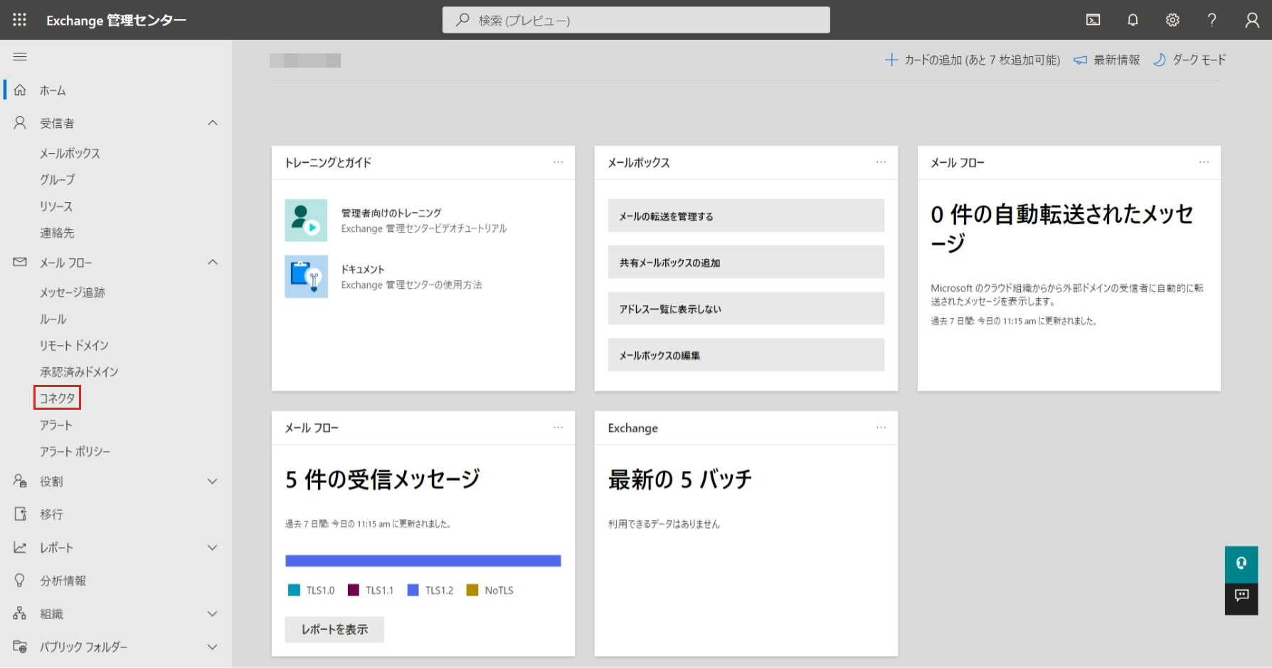 2. 画面左のメニューから[メールフロー]>[コネクタ]をクリックします。
