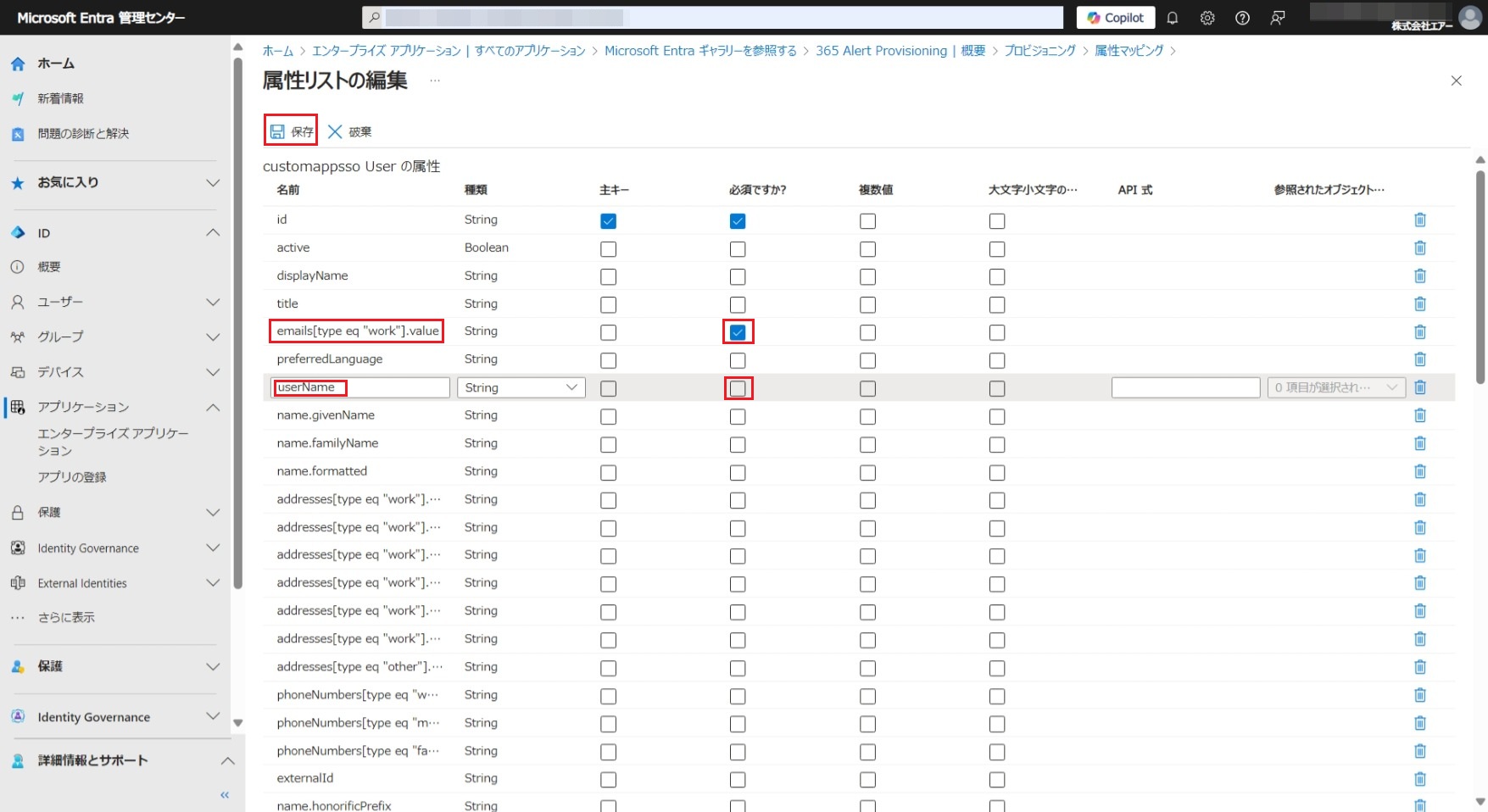 - 名前が「emails[type eq "work"].value」の行の「必須ですか?」列にチェックを付けます。