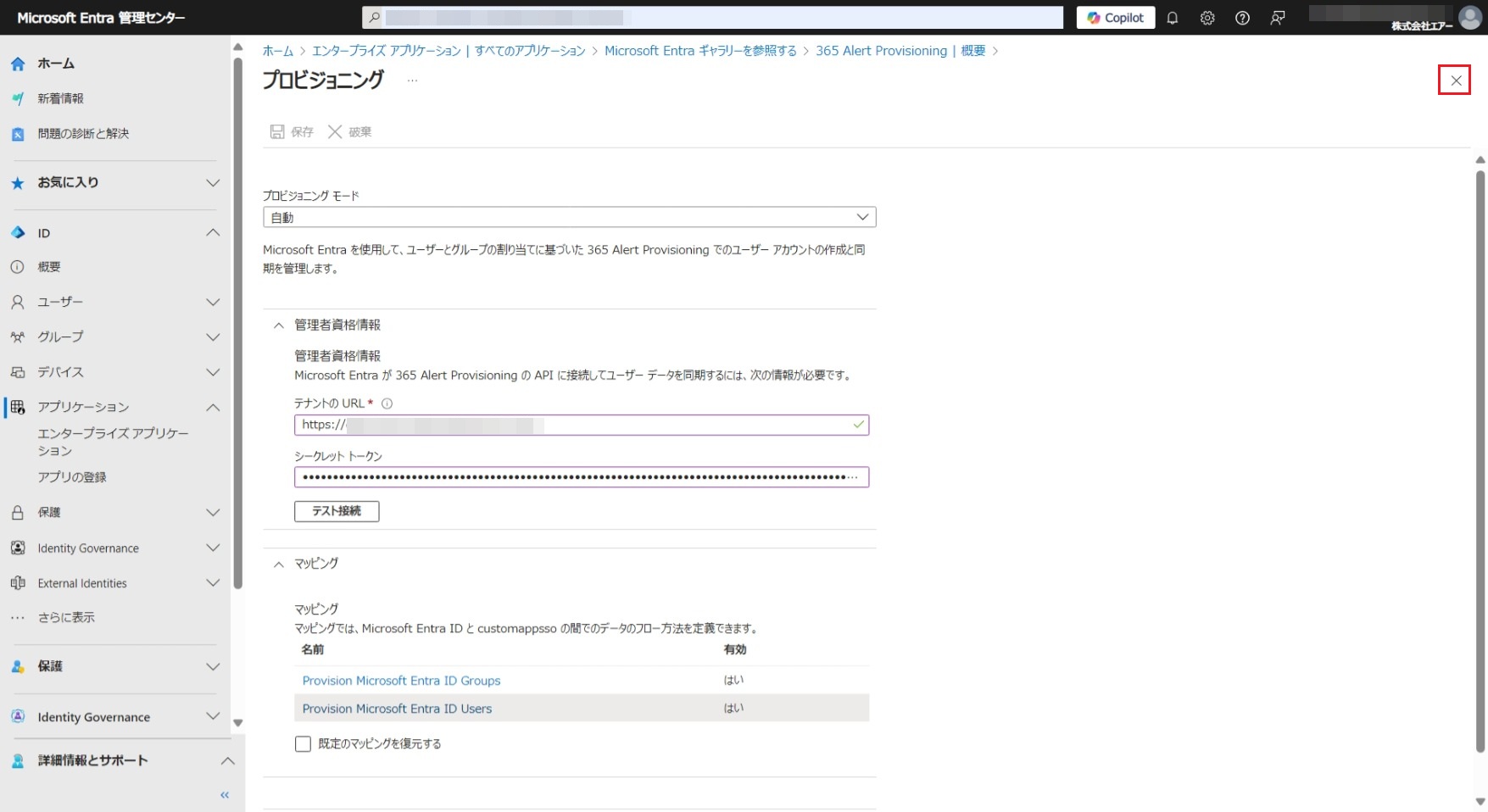 表示された[属性マッピング]画面の右上の[×]をクリックし、表示された[プロビジョニング]画面で、[マッピング]セクションの「Provision Microsoft Entra ID Users」リンクをクリックし再度[属性マッピング]画面を開きます。