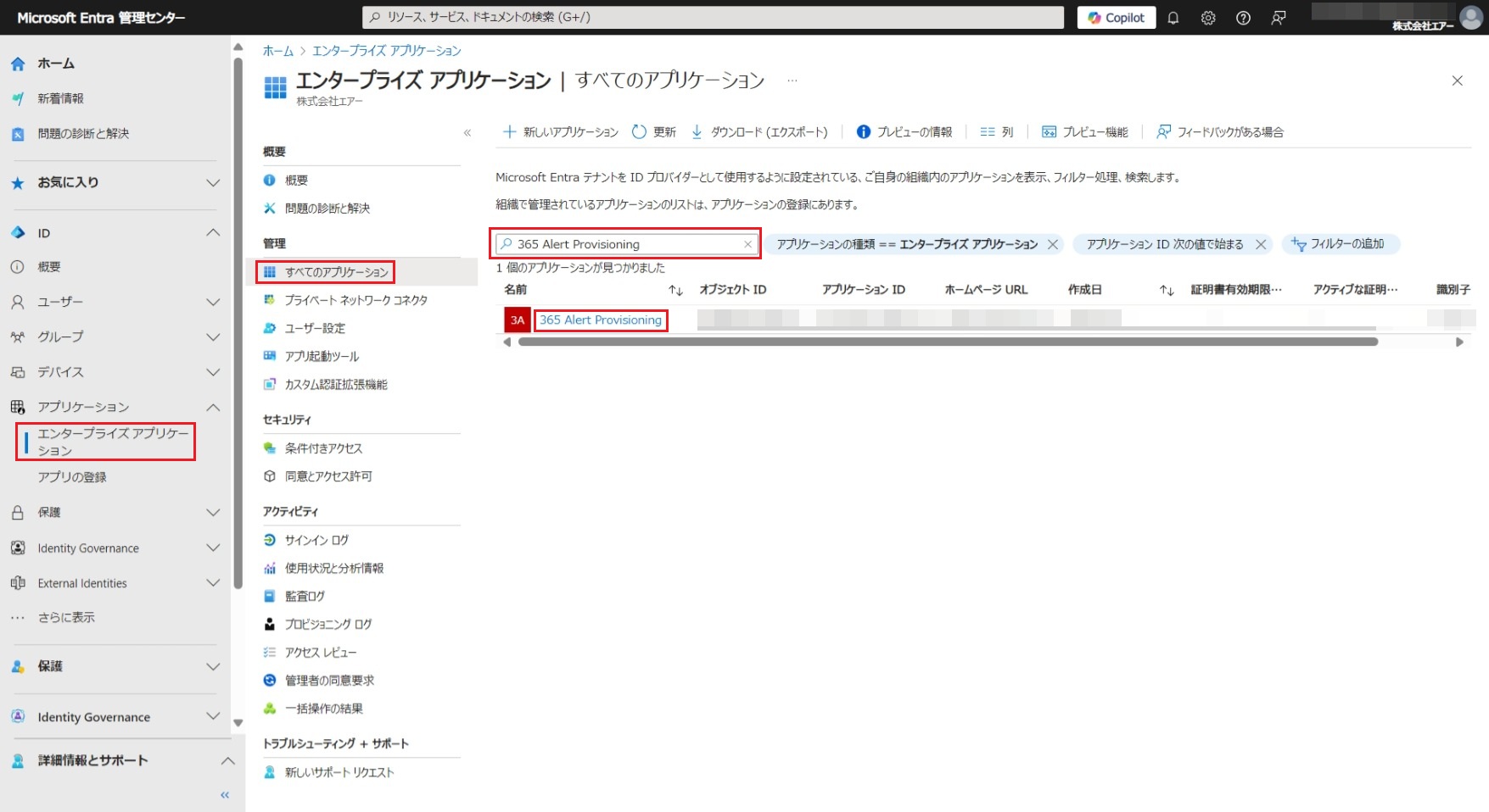 - Microsoft Entra ID(旧称Azure AD)に自動プロビジョニング用のアプリ(アプリ名は365 Alert Provisioning)を登録し、365 Alert Provisioningアプリに対する自動プロビジョニングの設定を行います。