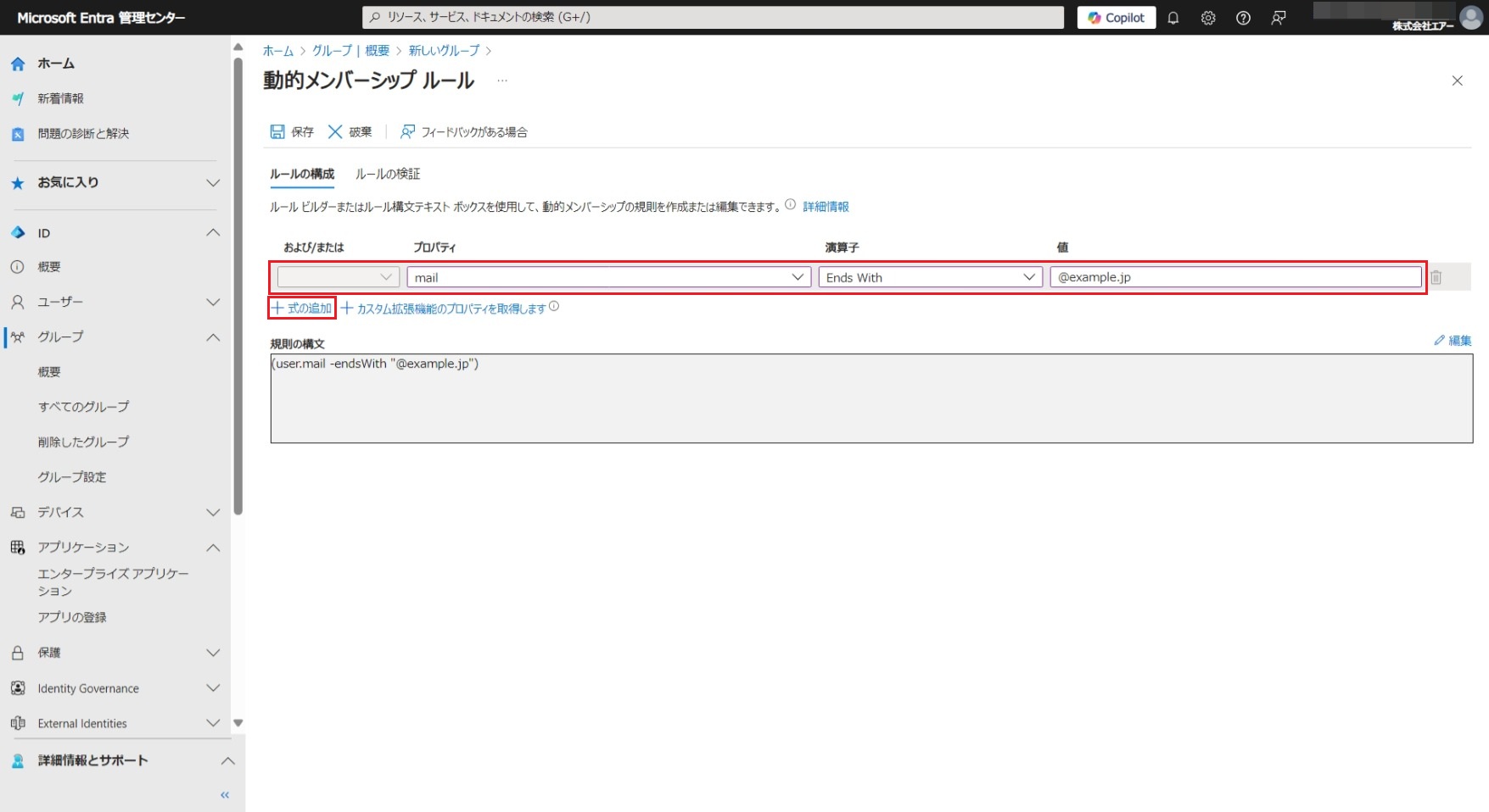 例えば、テナント管理者admin@example.jpとadmin@example.comを動的グループから除外する場合は[規則の構文]の[編集]リンクをクリックして、下記の規則を記入してください。((user.mail -endsWith "@example.jp") or (user.mail -endsWith "@example.com")) and (user.mail -ne "admin@example.jp") and (user.mail -ne "admin@example.com") -