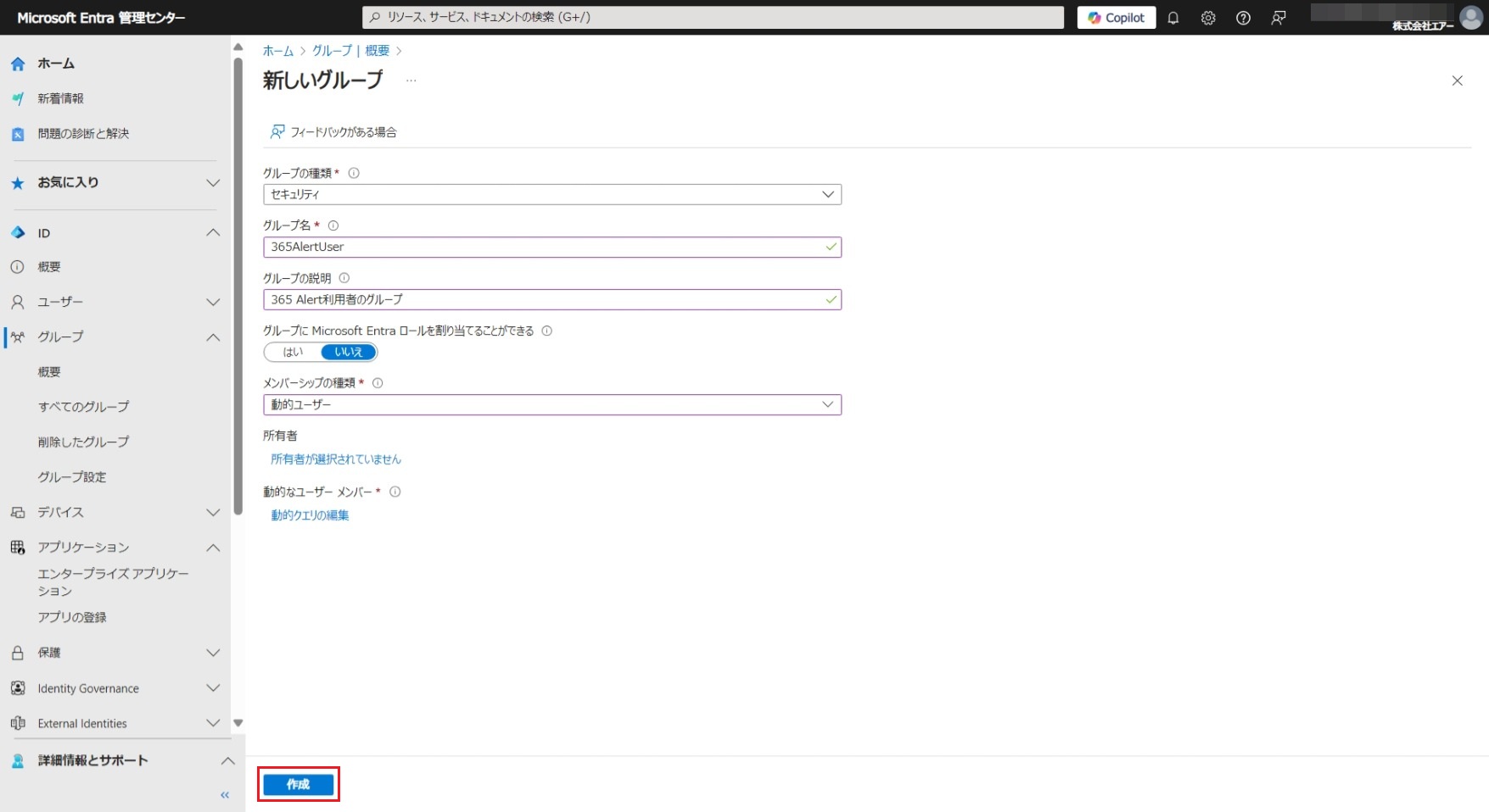 以下では、動的グループを使用して、自動で365 Alertに同期するユーザーを割り当てる方法を記載します。