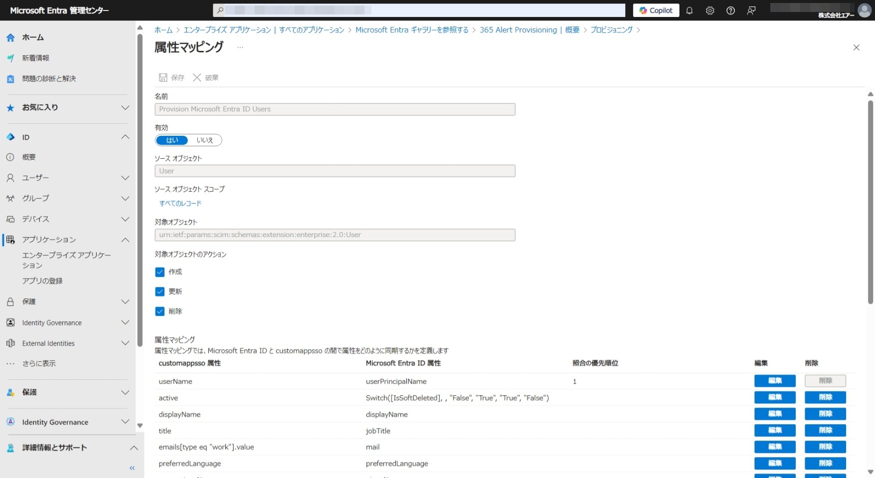 [マッピング]セクションの「Provision Microsoft Entra ID Users」リンクをクリックし[属性マッピング]画面を開きます。