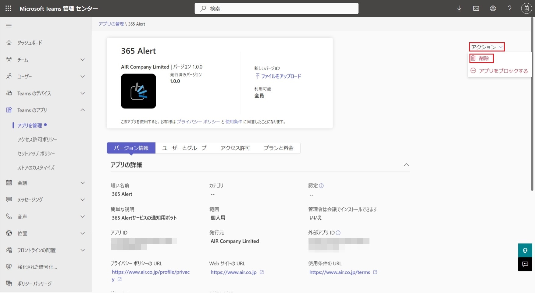 各ユ ーザーのTeamsにインストールされた365 Alertアプリはこちらを参照してアンインストールします。アンインストールはユーザー各自で実施していただく必要があります。