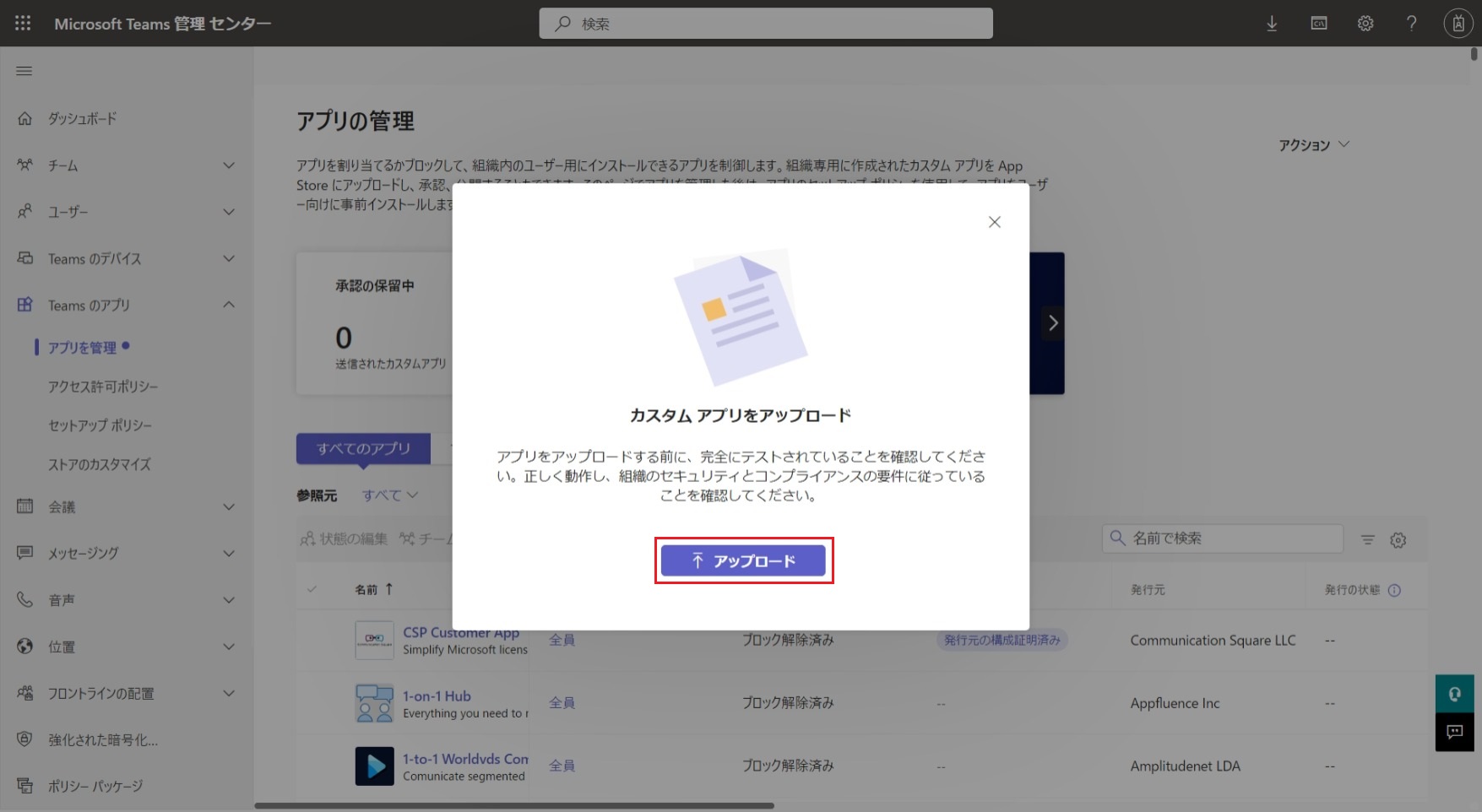 ユーザーがTeams通知を受け取るためのアプリをインストール出来るように、Microsoft Teams管理センターで365 Alertアプリのアップロードを行います。