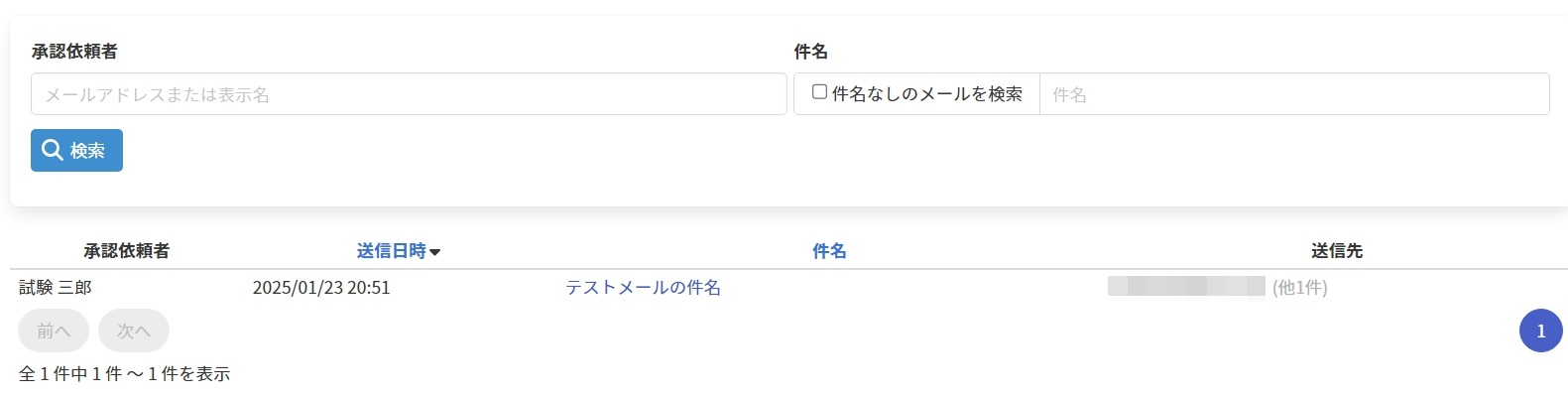 | 承認依頼者 | 検索対象第三者承認依頼の依頼者のメールアドレスまたは表示名を入力します。 メールアドレスまたは表示名は部分一致で検索されます。 |