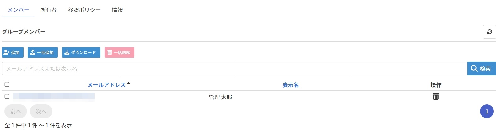 | 所有者 | グループ所有者の検索・追加・削除ができます。 詳細説明はこちらを参照してください。 ※ グループの種別が ポリシーの場合は表示されません。 |