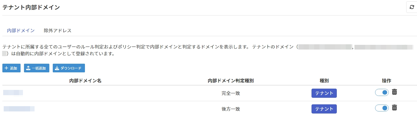 内部ドメイン画面では、内部ドメインと除外アドレスの確認・追加・更新・削除ができます。