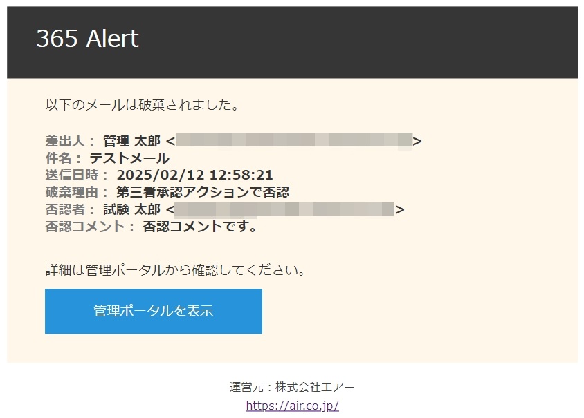365 Alertサーバーでメールが破棄された場合は、メールの差出人に以下の内容の[破棄通知メール]が届きます。