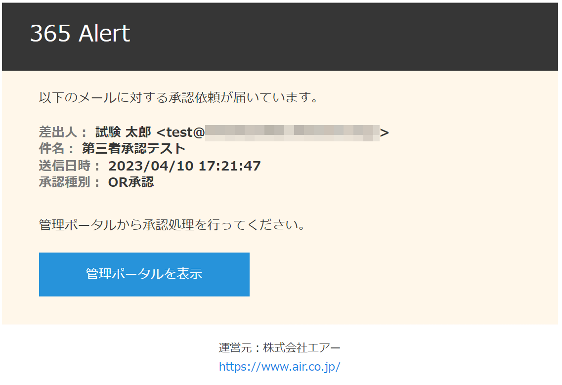 | 操作 | 本文内の管理ポータルを表示ボタンをクリックすると、ブラウザで管理ポータルの第三者承認依頼詳細画面が開きます。メールが承認・否認済みの場合は第三者承認履歴詳細画面が開きます。 |