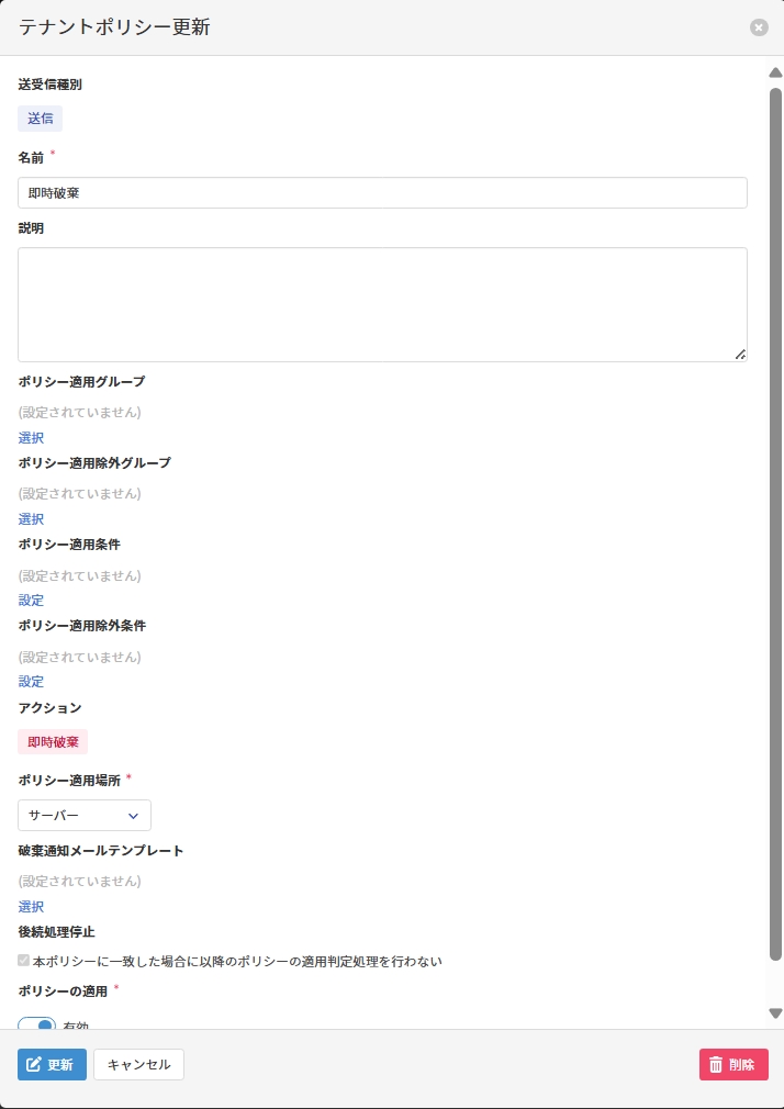 ポリシー更新画 面で以下の項目を入力し、[更新]をクリックしてポリシーを更新します。