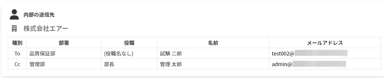2. [ユーザー情報表示設定を有効化する]が有効の場合は、送信Alert画面表示時に、[外部の送信先]と[内部の送信先]が以下のように表形式で表示されるようになります。