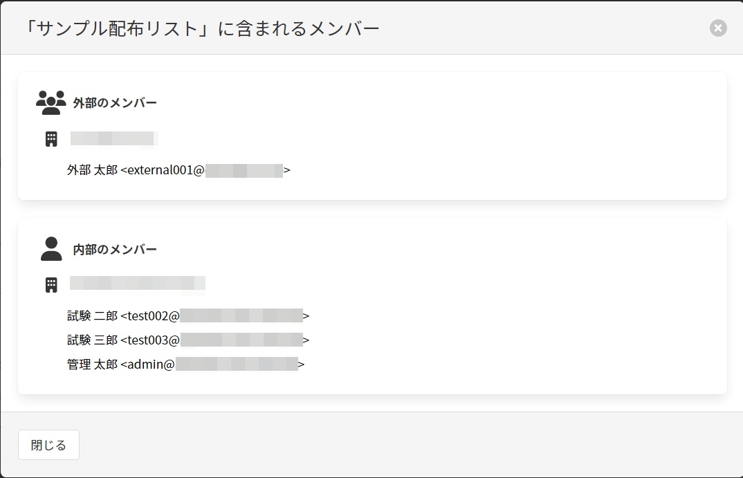 2. メールアドレスがdistribution_list_001@example.comの配布リストグループのメンバーがadmin@example.comtest002@example.comtest003@example.comexternal001@example.co.jpの場合、[グループのメンバーを展開して表示する]の設定値に応じて送信Alert画面表示は以下の通りとなります。