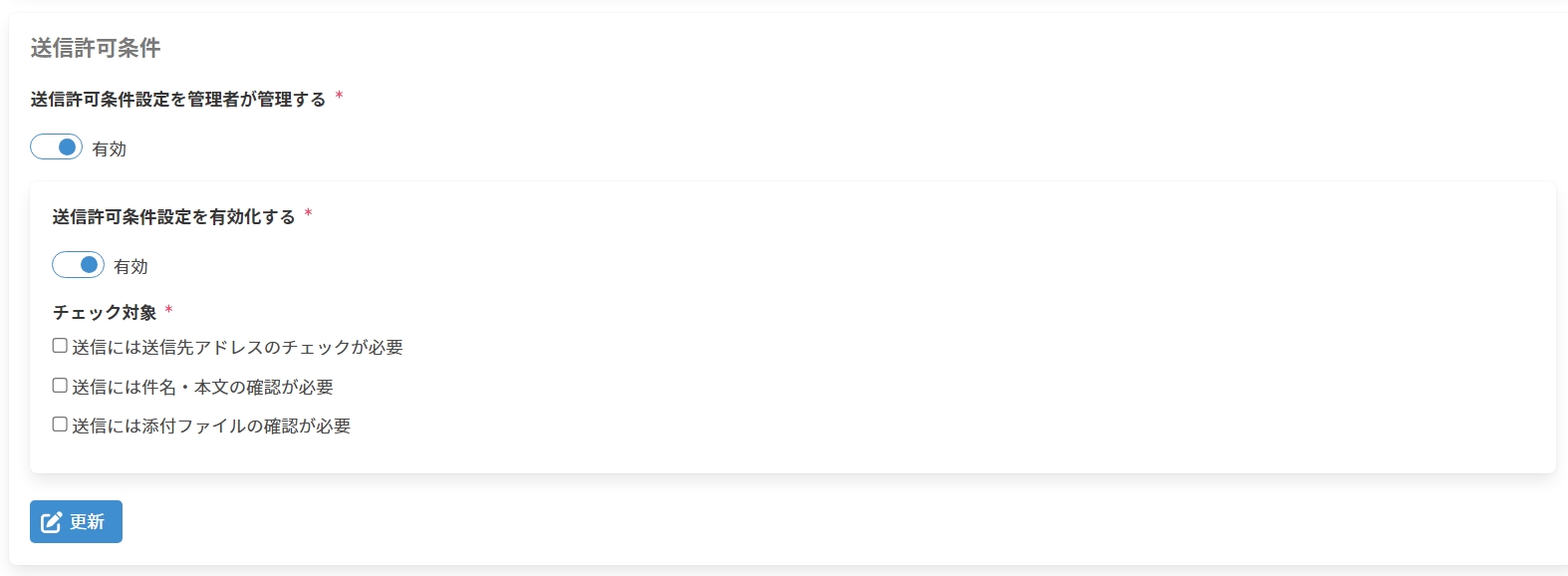 1. 以下の項目を入力し、[更新]をクリックして送信許可条件設定を更新します。