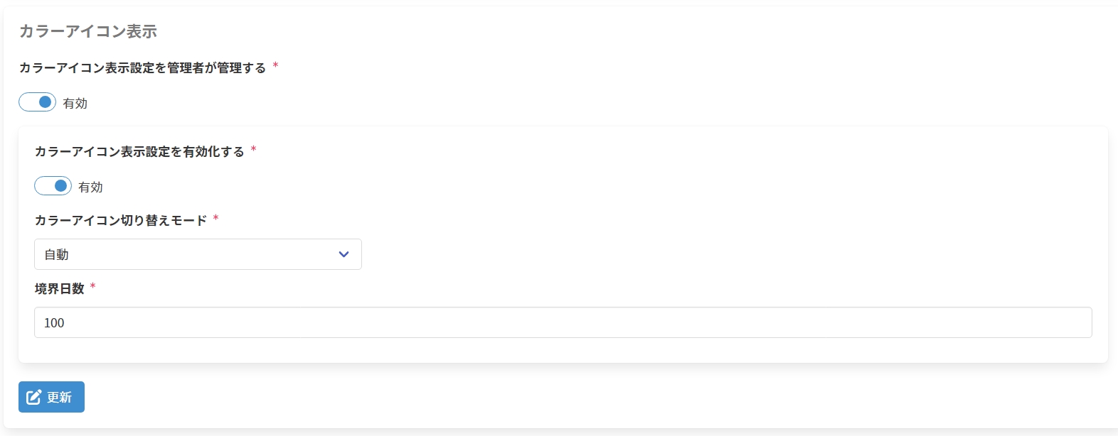 1. 以下の項目を入力し、[更新]をクリックしてカラーアイコン表示設定を更新します。