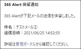 | SMTPサーバー | 365 Alertを経由したメールを配送する先のSMTPサーバーのホスト名が表示されます。通常 は、Exchange Onlineのホスト名が表示されています。 | Enterprise |
