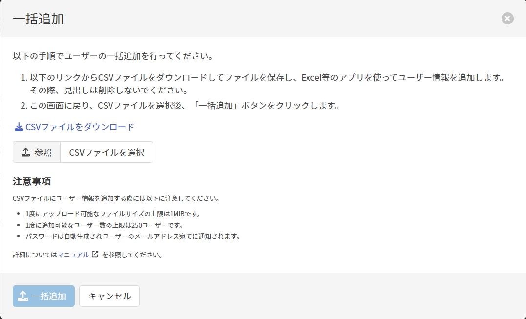 以下では、ユーザー画面からアクセス可能なユーザー一括追加画面で可能な操作について記載します。